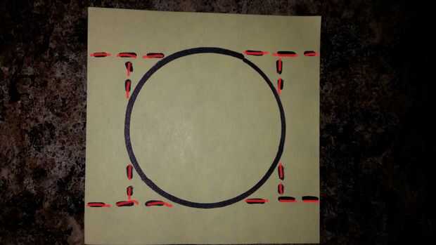 Cortar todas las líneas dibujadas en de las plazas, salvo las líneas donde la plaza se cruza con el círculo. Esto dejará los bordes de la frontera (que será la pared de la canasta) conectados a la base del círculo. Los puntos que no se cortan (donde la plaza se encuentra con el círculo) será usted plegable puntos para las paredes. La foto de arriba muestra las líneas de corte en rojo.
