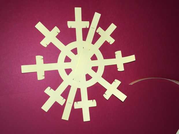 Continuar tejiendo la tira sobre el centro, debajo de la rueda y hacia fuera hasta que incluso con todos los radios. Es posible que observe pequeñas muescas en la tira. Los representan donde debe ser doblados más adelante, pero se puede utilizar para alinear la tira con el borde de la rueda.