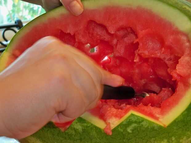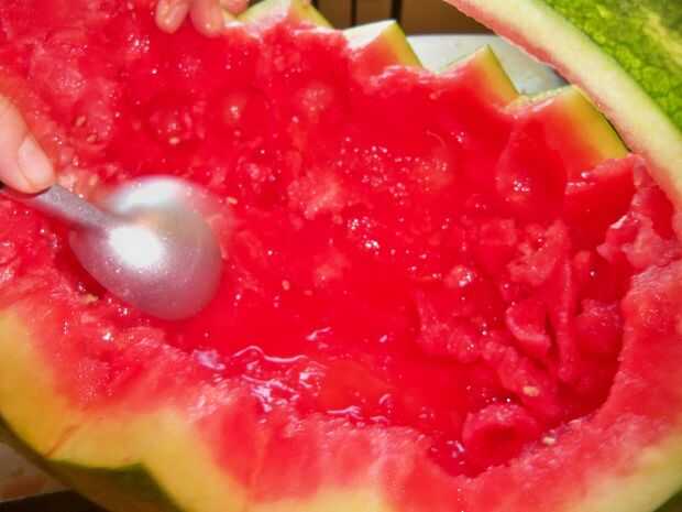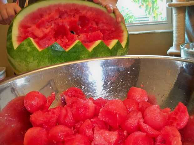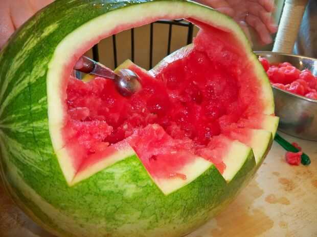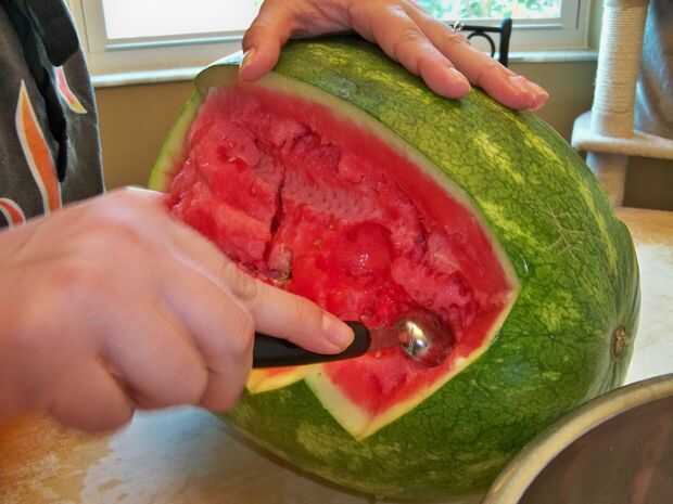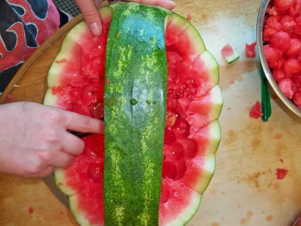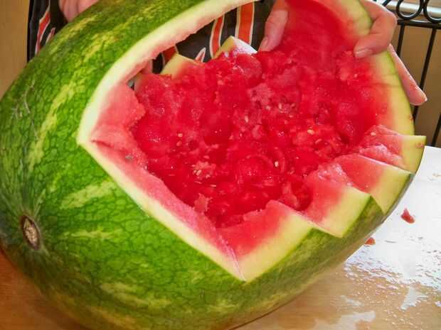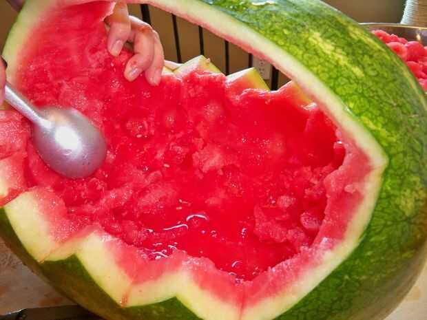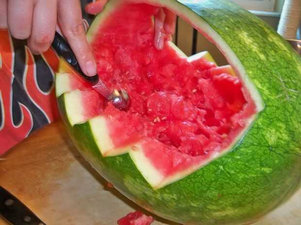 Ahora empiezan a sacar la carne del melón para totalmente hueco el melón.  Utilizar a un melón al principio para quitar piezas bonitas que puedo poner detrás en la cesta más adelante.  Una vez que el melón se quita sobre todo cambio a una cucharada del helado.  La manera más eficiente para raspar el interior del melón sobra.  Probablemente usted tendrá que verter el jugo hacia fuera varias veces para que puedan ver lo que tu hacer.  Si revisas las fotos puedes ver cómo es más fácil trabajar a través de la parte superior para abrir un espacio para terminar la parte inferior.