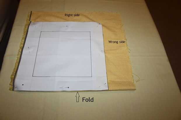 Doblar a la tela en dos del lado derecho hacia dentro. Coloque la plantilla sobre los pines y corte la tela.