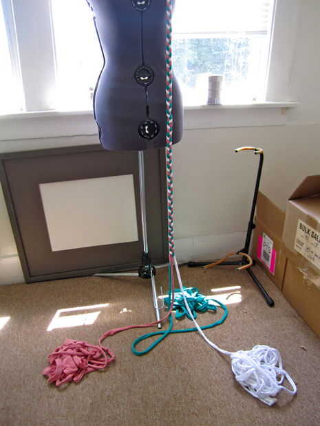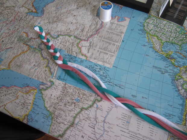 Que se enrede bastante porque los extremos son tan de largo (ver ilustración 4 - sí mismo trenzas más abajo!), pero esto puede ayudar un poco por el extremo de la trenza a algo y tratando de mantener el hilo de la camiseta en tres montones separados. Ocultó en espalda (almacenamiento habitación?) de los gatos de cazador feroz de camiseta hilo y cubrió el final de la trenza a maniquí de mi modista y conseguido!