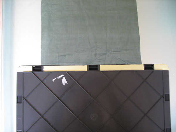 Primero voltee la cesta y poner alguna cinta en el borde de la parte delantera. Pero no pegado de la cinta sobre los orificios, porque necesitamos más adelante.