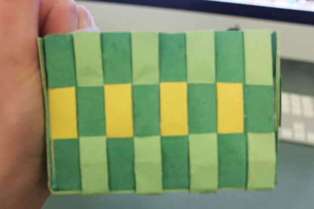 Esto es cuando tiras la pared entran en juego. Tomar una tira, entretejido entre un lado de la pared en curso para que cubra las tiras de 1 color y muestra la 2da. Asegúrese de que la banda se reúne con donde se teje las otras tiras. Cuando termine, primera cola tiras de 1 color a la franja de la pared, luego hacer lo mismo con la 2ª.