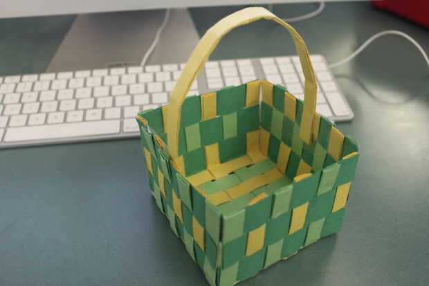 Si quieres un mango, es bastante fácil de añadir. Simplemente corte una tira de cualquiera de sus anteriores colores, 2 pulgadas de ancho y 11 pulgadas de largo. Hacer el mismo proceso que hiciste con las otras tiras, doblar por la mitad y doblar los bordes en pegando entonces por lo que es de.5 pulgadas de ancho. Pegamento/cinta/grapa/lo que sea que el interior de la cesta, 1 pulgada por debajo del borde de la pared.