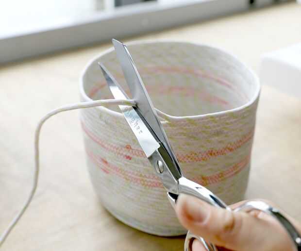 Cuando piensas que has hecho la pared lo suficientemente alta como para su aplicación (mi maceta era 4 3/4" de alto = 5" pared) corte el paracord dejando alrededor de 1 1/2" cola.