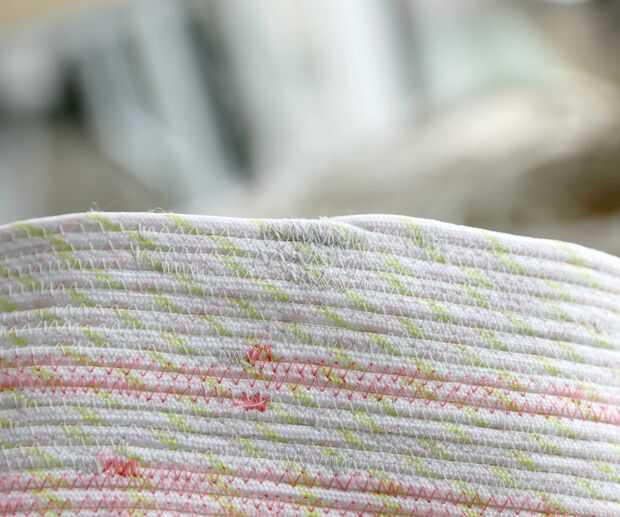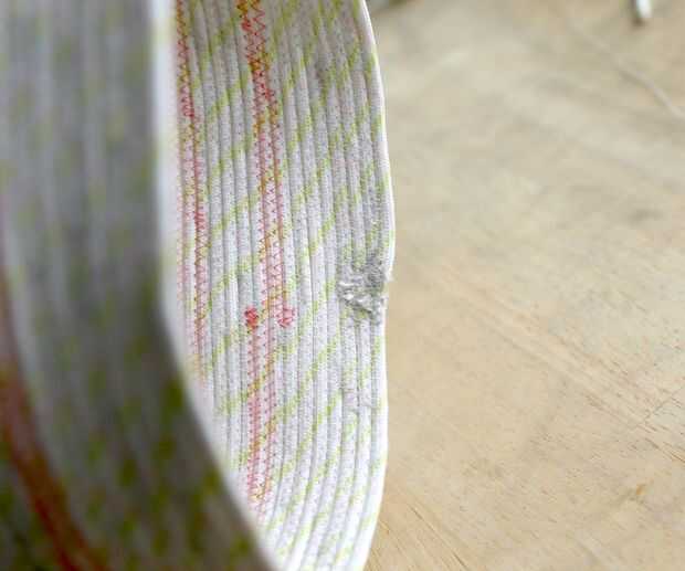 Dejando la configuración en zig-zag, doble cola corta sobre el interior de la cesta y coser en su lugar con la costura hacia adelante y hacia atrás, asegurándose de coser los pedacitos del extremo deshilachado y salvaje.
