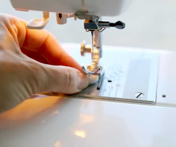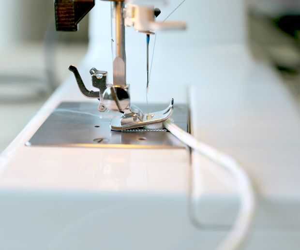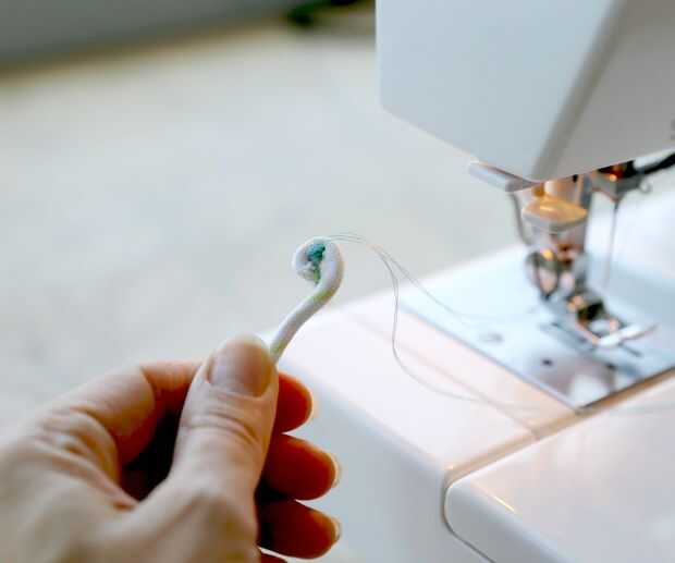 Pellizque la bobina pequeña 'semilla' y colóquelo con cuidado bajo el pie de la máquina de coser, bajando los pies una vez que esté en su lugar.