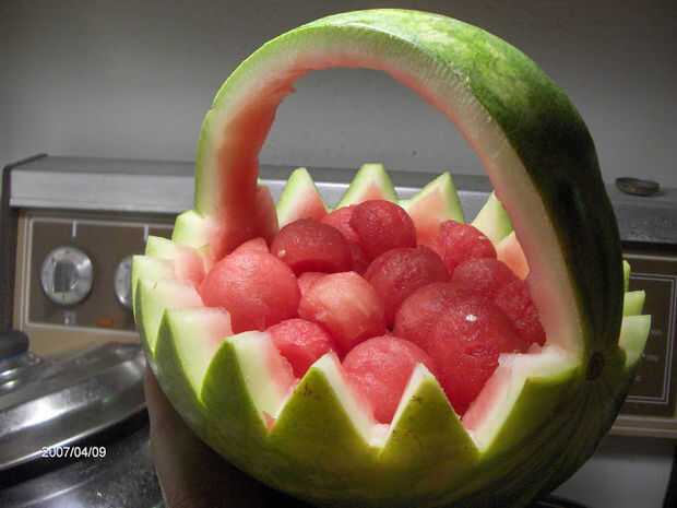 Coloque bolas de sandía en la cesta y chill hasta listo para servir, cubierto en envoltura de plástico transparente (también puede colocar unos cubitos de hielo antes de colocar las bolas de sandía).