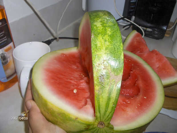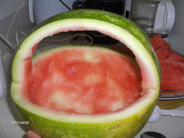 Corte como se muestra en la primera foto, luego sacar la carne de la sandía (puede utilizar melón o un solo sector con cuchillo o incluso una cuchara (melón da bonita forma redonda tho!), como se muestra en la segunda foto.