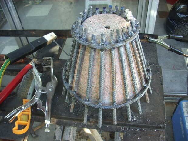 Con un poco de trabajo y con la ayuda de algunos hechizos de encantamiento como "oh, SH... quedan!" He podido localizar algunos largueros en su lugar, apoyada precariamente por ambos anillos. Entonces empecé a soldar. Era la parte larga de la obra, me llevó más de una hora. Finalmente encontró que 22 vigas, separadas más o menos uniformemente.