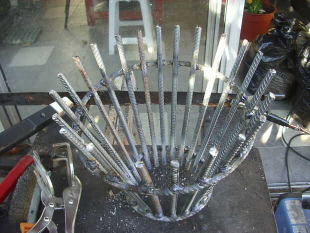 Con un poco de trabajo, y ayudado por algunos conjuros del tipo de "¡pero la p... quedate ahí!" logré ubicar en sus lugares algunos largueros, sostenidos precariamente por los aros de soporte. Entonces comencé a soldar. Fue la parte larga del trabajo, me llevó más de una hora. Finalmente ser ser 22 largueros, separados más o menos uniformemente.