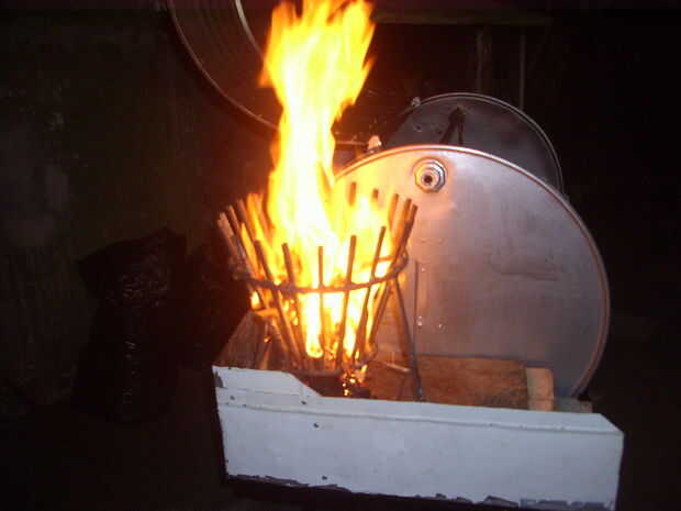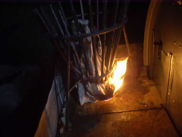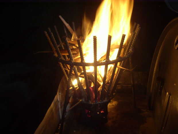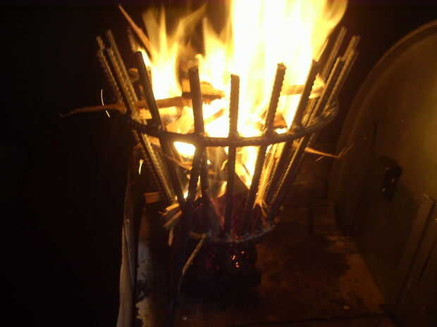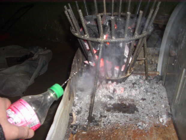 Poner en la cesta/tolva una hoja bien arrugada de periódico, le prendieron fuego por debajo, luego fue rápidamente añadir virutas de madera alrededor hasta que se convirtió en un fuego lo suficientemente estable para comenzar a añadir trozos de carbón. Después de unos segundos, tal vez dos minutos, fue como se pretendía. Siendo la madera y el carbón está expuesto al aire, combustión es facilitada en gran medida. En unos diez minutos y tuvo suficiente carbón para comenzar a poner debajo del grill. Me tiró de la parte inferior y había añadido algunos carbón en la parte superior. En medio del asado me di cuenta que había subestimado a eficacia de chulengo (barbacoa), consumir menos carbón que la cuadrícula tradicional. Así que tuve que moderar las brasas que tenía en la cesta, para lo cual utilicé una botella de refresco pequeña llena con agua, con un agujero en la tapa. Que me permite controlar la cantidad de agua para verter y punto del tablero a las brasas elegidas (foto de lasta).