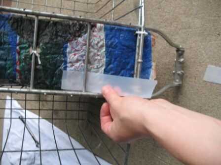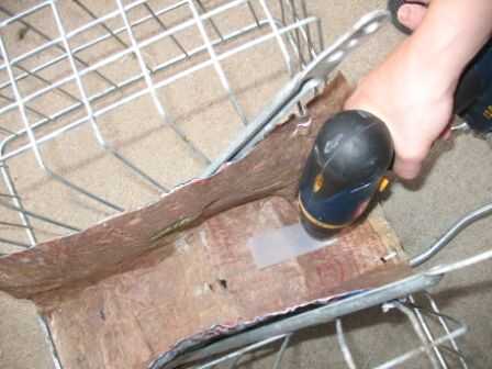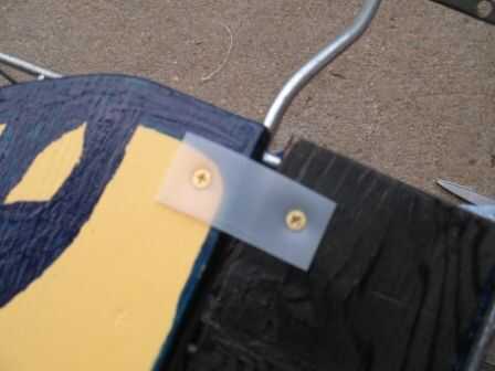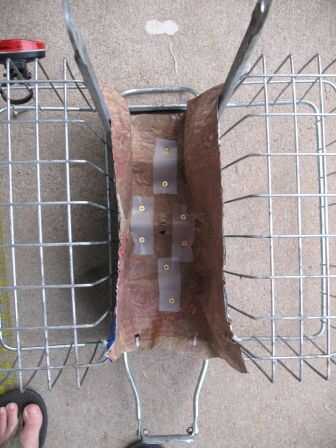 10. pedazo de segura centro cestas. Voltee sus canastas y empujar el pedazo de centro del cuerpo por debajo. Centro hacia arriba. Esto será más fácil si usted no tiene un guardabarros de plástico reciclado tela ocultando su visión. Tomar una tira de su botella de leche, póngala sobre el alambre central y comenzar a atornillar abajo. Sus tornillos deben ser bastante cortos, así que no te molestes en hacer agujeros piloto--no es necesario. También, probablemente vas a querer cuatro piezas - dos en el frente y la espalda. Tenga en cuenta que las piezas de la botella de leche sólo a horcajadas el alambre, así que si las correas de seguridad no tan lejos hacia fuera al borde como usted puede conseguirlos, el pedazo de centro será capaz de deslizar hacia adelante y hacia atrás a través del cable.
