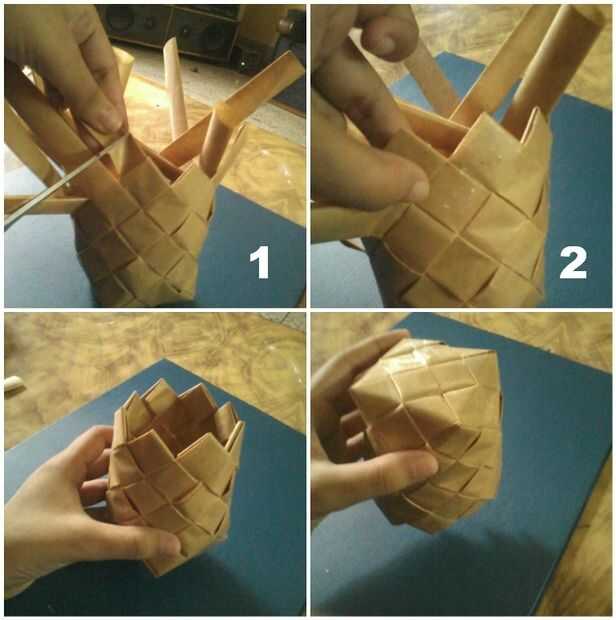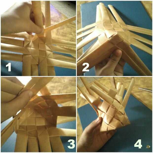 Tomar incluso el número de tiras para hacer esta canasta, que hace más fácil. Colocar 4 tiras (tiras de regular como he demostrado en el primer paso) verticalmente y 4 tiras horizontalmente. Apretar el tejido con cuidado y asegúrese de que las tiras estén aún. Las líneas plegables que he mostrado en la primera foto de este paso. Doble las tiras de cualquier lado y empezar a tejer, colocando una tira sobre la otra (como se muestra en la imagen 1 segundo de este paso). Este tipo de tejido forman una esquina como se puede ver en la imagen de segundo-2. Continuar tejiendo como esta y después de un paso a forma una figura como la imagen del segundo 4. Puede doblar las tiras restantes dentro o cortarlas en piezas más pequeñas y luego doble interior. Use pegamento y doblar, para que no salgan.