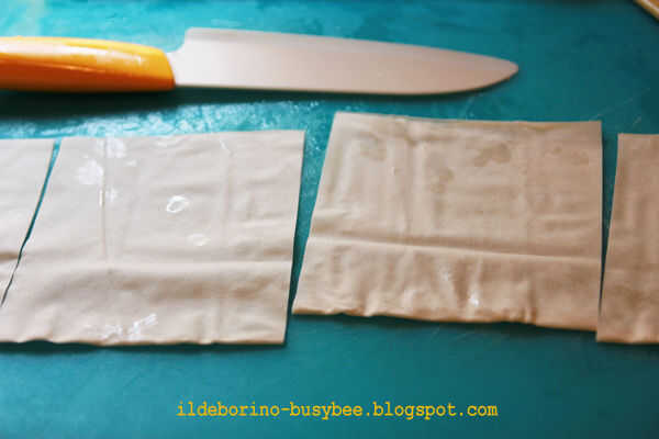 Rodillo hacia fuera las dos láminas de pasta fillo apilados, cortar en tres partes longitudinalmente y cortar otra vez cada tira de pasta en 4 partes. Esto le dará 24 cuadrados de pasta fillo.
