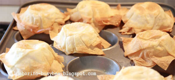 Gire suavemente las cestas de fillo y colóquelos en una hoja de la hornada. Cueza al horno otra vez para un par de minutos para que incluso la base de las canastas doren. Sacar del horno y deje enfriar.