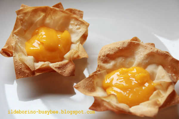 Justo antes de servir colocar las canastas en un plato y rellenar cada una con 2 cucharadas de crema de limón.