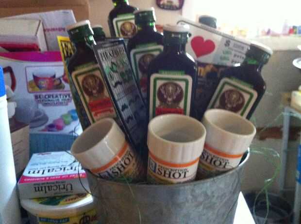 Fake hierba, espuma floral, tipo palitos de paleta, cesta, botellas de alcohol mini, rasguño de billetes de la lotería o lo podrían disfrutar de tus amigos o familiares (chocolate, cecina de buey, nada realmente)