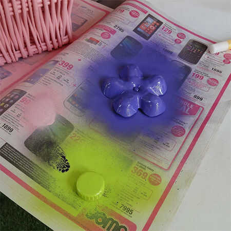 2. también debe rociar las flores de plástico y tapa. Use colores contrastantes si quieres ir en negrilla, o elegir tonos sutiles para un efecto acabado más suave. Utilizamos uva y limón Rust-Oleum 2 X UltraCover lustre.