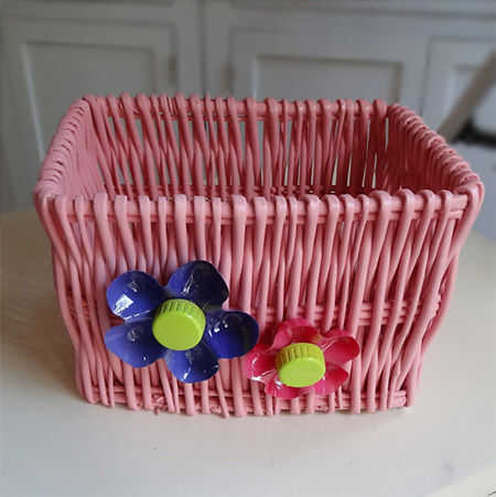 3. deje que la pintura seque completamente antes de usar una pistola de pegamento caliente para fijar un tope a cada flor. Luego se pegan las flores montadas en la parte delantera de la canasta. Tan fácil como eso...!