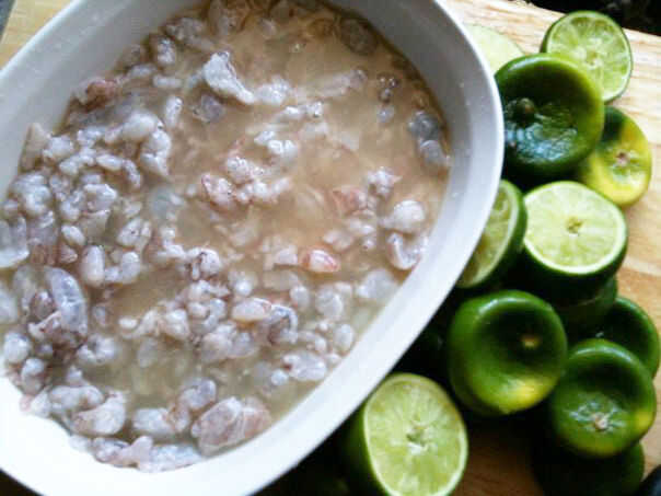 este es un plato muy sencillo y refrescante, perfecto para verano.  Espero que lo disfruten.Ingredientes:6 limones (regordetas como usted puede conseguirlos)1/2 libra de camarones crudos1/4 libra de carne de cangrejo cocida1 tomate maduro1 pepino1 ja