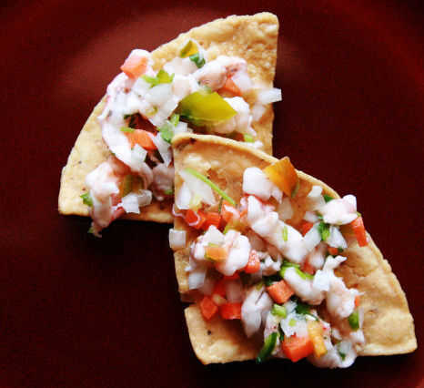 Ceviche es una merienda de verano que es rápido y fácil de hacer. No requiere horneado! Sólo mezcle algunos camarones con jugo de limón, jalapeño, cebolla, tomate y pepino y disfrute! Esta receta nutre sobre 2-4 personas.Ingredientes:1/4 libra de cam