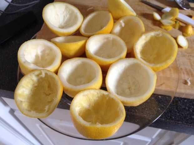 Cuando has hecho las tazas Coloque en una bandeja o plato grande y ponerlos en el congelador hasta que estén listos para llenarse. (El ceviche es un plato que se sirve mejor frío. Congelar las tazas de limón esto ayuda mucho y les da cierta integridad estructural)