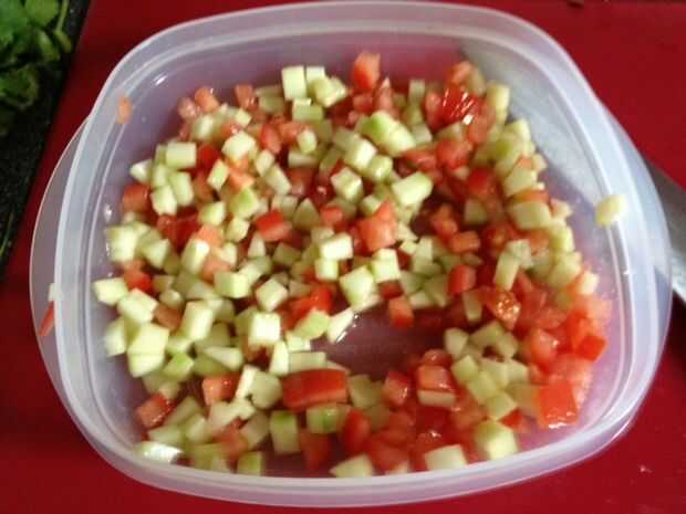 Mientras los chalotes, el ajo y el jalapeño son marinado con los camarones Retire tanto de las semillas y el líquido de los tomates y el pepino y córtelos en trozos pequeños y relativamente uniforme para arriba. Poner en un tazón o recipiente plano cara alta y agregar 1/2 a 1 cucharadita entera de sal dependiendo de cuanta sal le gusta. Usted puede Agregar un chorrito pequeño de aceite de oliva también sólo para cierta riqueza, pero no tienes que. Mezcle bien y deje que se sientan en el contador para sobre una media hora para que la sal puede intensificar los sabores.