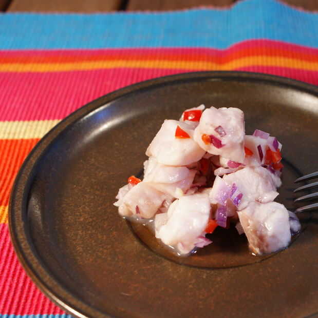 Esta es la receta básica: corte el pescado en lugar de cubos o tiras, pequeño en un recipiente cubre con jugo de limón y dejarlo macerar durante 10 a 15 minutos.