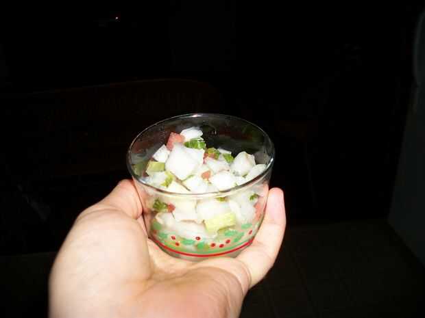 Observe cómo no he mencionado ningún tipo de cocción. Este plato es esencialmente crudo. Ácido, generalmente un cítrico de algún tipo, se utiliza para desnaturalizar las proteínas en los peces, así como para romper un poco las verduras. Desnaturalización es cuando las proteínas son desdobladas. Cuando cocinamos nuestros alimentos utilizando el calor, también desnaturaliza las proteínas, pero hay mucho menos patógenos que preocuparse.
