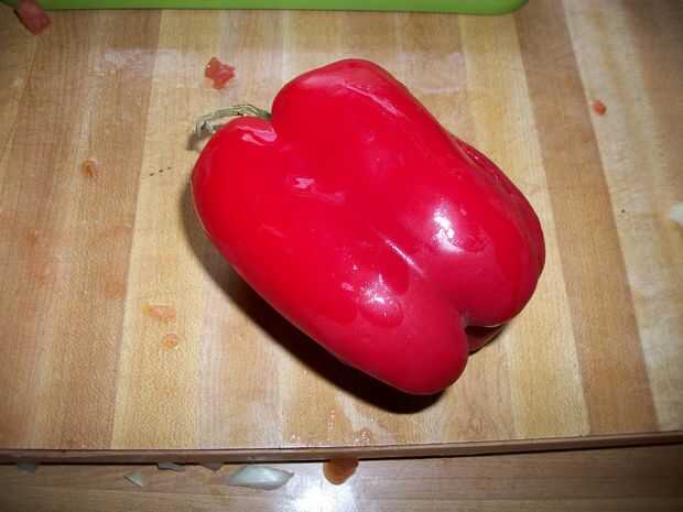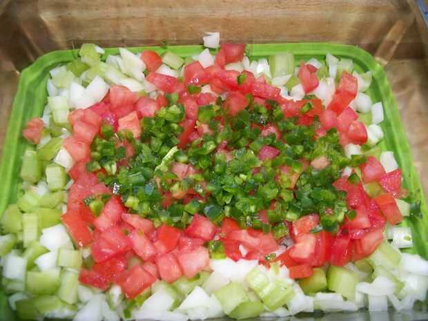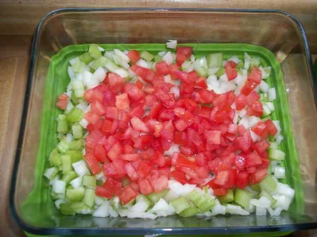 La siguiente capa será tomate que debe tener sus semillas quitados. Un tomate firme funciona mejor porque un viejo no va a tolerar el frío de la nevera ni el pozo de ácido. Esta capa está representada en el cuadro 3. Después de esta capa viene el pimiento, este presenta dos opciones en esta receta. Uno puede utilizar un pimiento picante o una dulce (uno puede tener si quieren aunque).