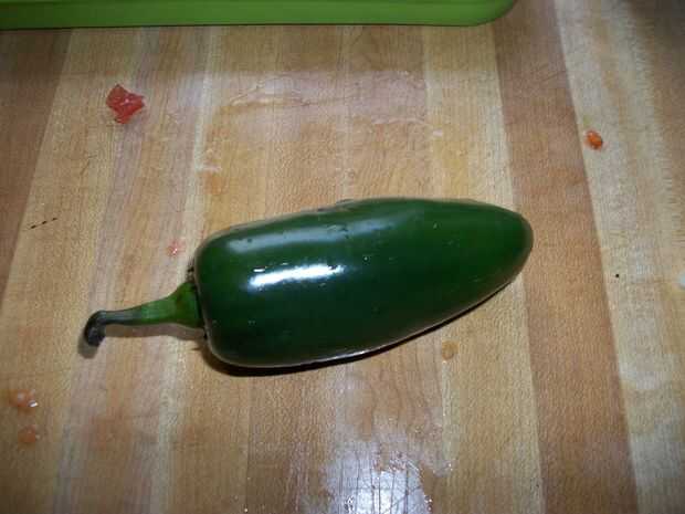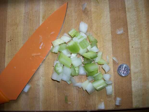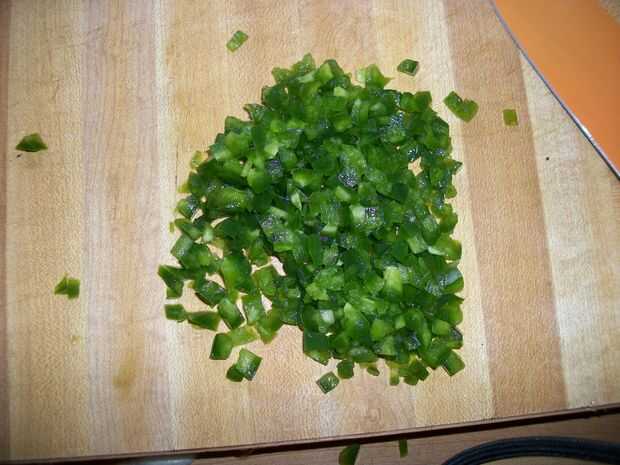 Costarricenses normalmente rehúyen de comida demasiado picante, su alimento es generalmente leve y casi anodina por lo que un pimiento como la campana roja es más común. Con un pimiento, centímetro cuadrado piezas son buenas, pero con un caliente, es mejor cortarlo tan pequeños como posiblemente para distribuir mejor el calor y el sabor. Sólo tenía un jalapeño en el momento de hacer este plato por lo usé en lugar de la campana dulce que me gusta mucho. Puedes ver a continuación cómo es capas otra vez en el cuadro 7.