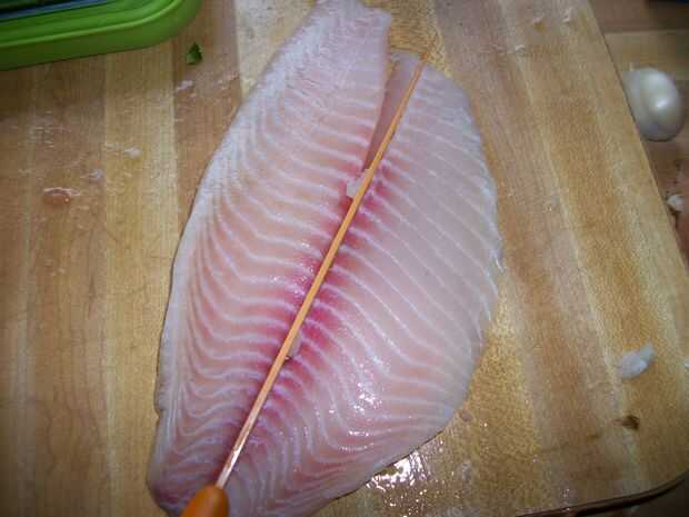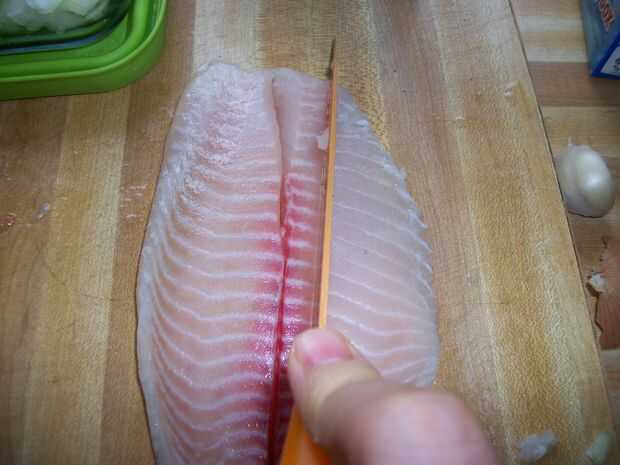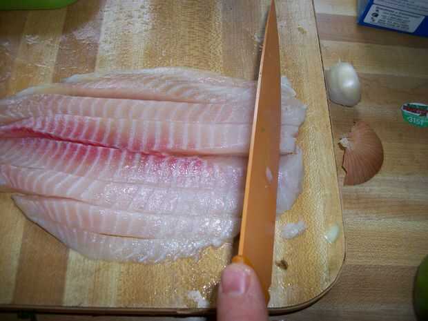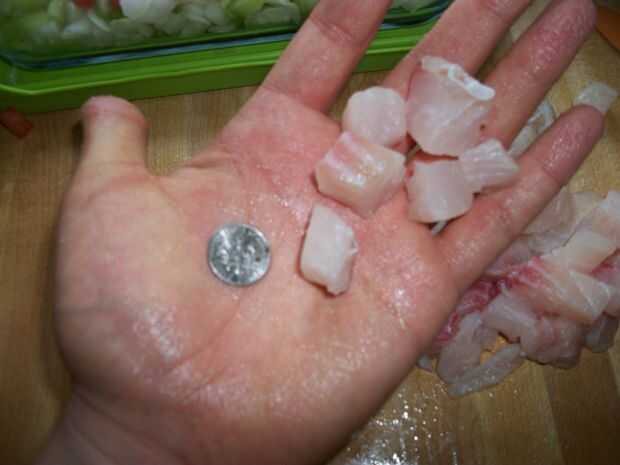Estoy trabajando con tilapia en estas fotos. Mi familia me enseñaron a ir contra el grano al realizar los cortes iniciales en los peces. Esto permite que las piezas quieres mejor juntos. El proceso se muestra a continuación en las fotos, pero básicamente hacen cortes verticales a contrapelo a la anchura de su elección. Mi objetivo para sobre un centímetro cuadrado aunque tamaños de hasta una pulgada no son infrecuentes. Después se hacen cortes verticales, horizontales se realizan para obtener la forma de cubo. Los trozos no a gusto de uno pueden recortar más. Sé que el centro del lomo tiende a molestarme.