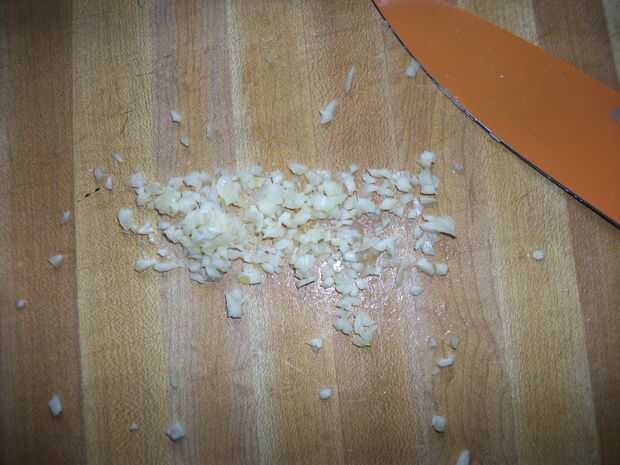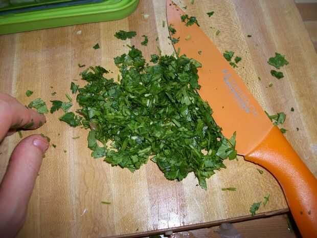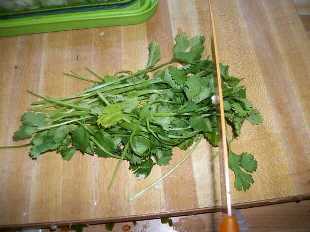Ahora el cilantro y otras especias están listos para entrar en el plato. Mientras que el cilantro es imprescindible que para el sabor, el ajo y otros pueden ser saltados sin demasiado perjuicio. Yo no soy demasiado grande para usar sobre 1 o 2 dientes más de ajo y varios batidos sal y pimienta. Mi familia usa unos 3 clavos de olor y una cucharadita de sal.