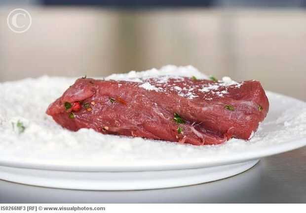 Después de varias horas, dragar la carne en algunos todo uso harina. Cubrir bien y sacuda el exceso. (no se muestra)