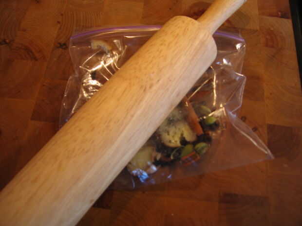 Poner todas las especias en una bolsa de plástico sellable y moretones por golpes con un martillo o un perno de balanceo. No enloquecer, aunque son moretones no destruir.