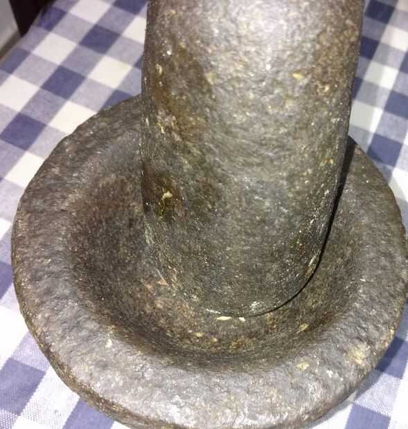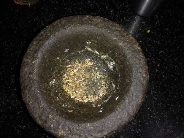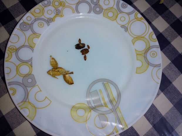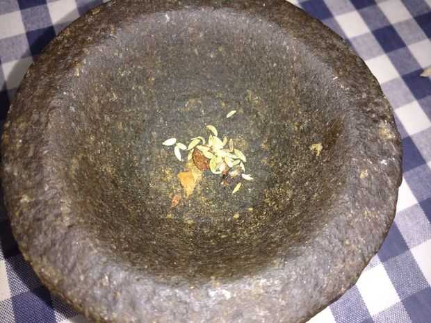 Cardamomo molido, semillas de hinojo y clavo de olor en un molinillo de café. Usé un molino de piedra para machacar las especias. Mientras machaca Asegúrese de quitar el salto del cardamomo.