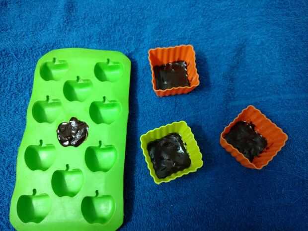 Vierta el chocolate a los moldes. Usé estos moldes del silicón de apple.