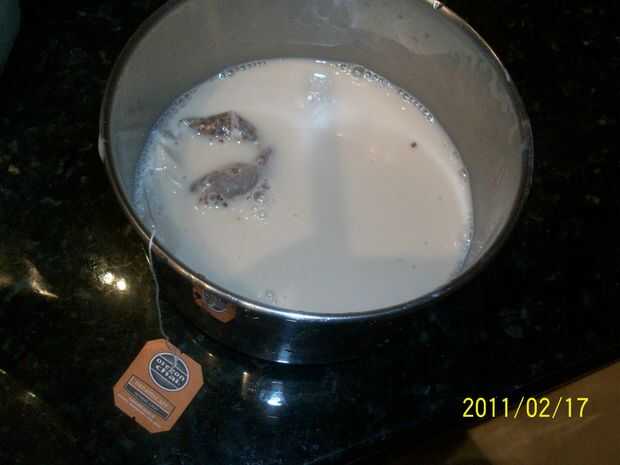 Vierte en la cacerola y añadir todo menos las perlas. Usé 4 cucharadas de azúcar. cucharadita de cardamomo, una bolsa de té chai.