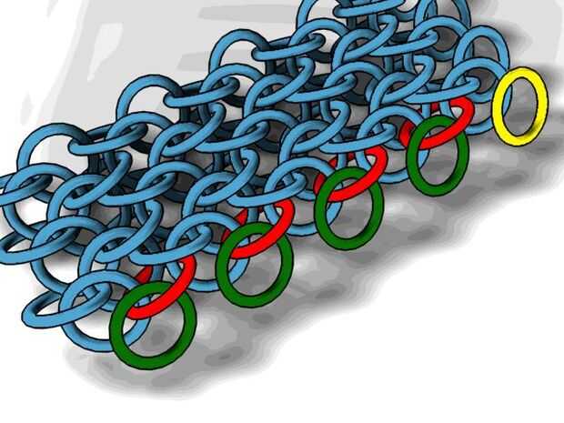Paso 16: Ahora tenemos que invertir la conexión, pero mantener el flujo. Hacer esto mediante la adición de otro conjunto de 1 en 1, asegúrese de que completan grupos de 4 en 1. Nota aquí el anillo de color amarillo, está flotando en el espacio medio. Se trata de un anillo que le tienes que añadir más tarde. Tenga en cuenta que la fila fuera siempre tendrá este anillo aparentemente extra para completarla.