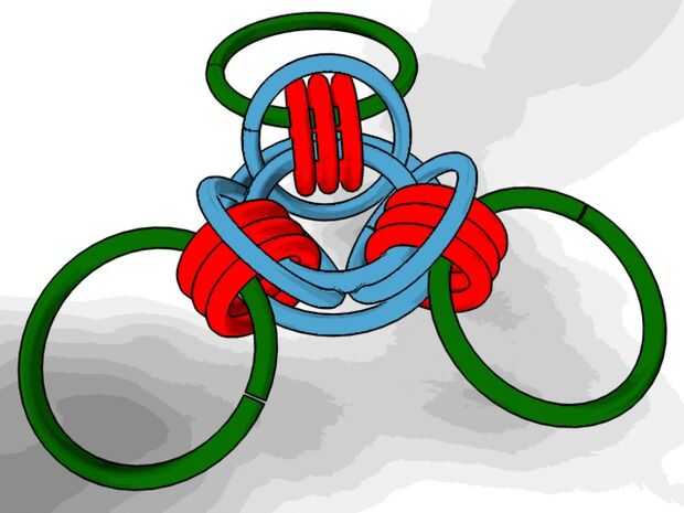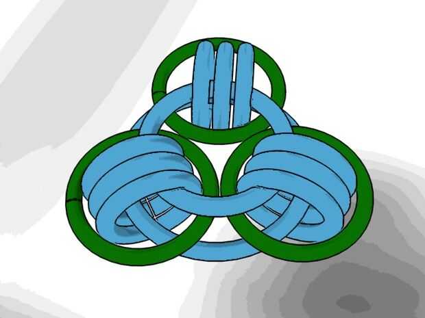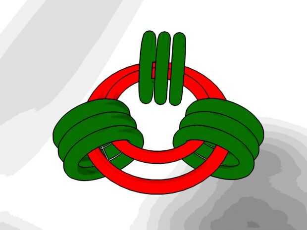Paso seis: Ahora comienza la diversión parte, vamos a añadir un anillo orbital en la intersección de los anillos medianos en el centro sosteniendo allí. Ahora doblar las dos más grandes sobre los costados sosteniendo al cautivo del anillo en el lugar. Siguiente a través de todo ese tejido de lío en tres pequeños anillos a través de los anillos de medio de centro de ahora y los anillos grandes.