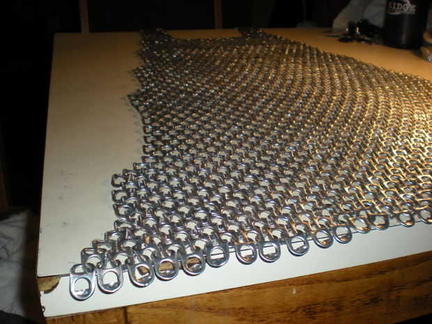 Como se describe en el Chainmaille Pop ficha Instructable - cortar las lengüetas en la parte superior y dóblelos en posición con el removedor de la grapado. Encontré que trabajando desde la parte inferior de la capa hacia la parte superior, una fila a la vez, hecho mucho más fácil para conectar las fichas. Un truco fácil para colocar las fichas en la posición correcta es pensar en la curva como una flecha - si te deslizas en la pestaña con la esquina izquierda, señalando la ficha terminará en el lado izquierdo.
