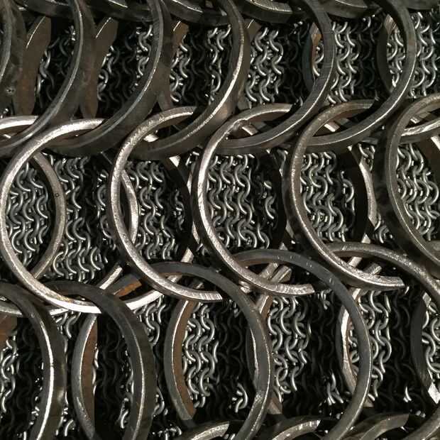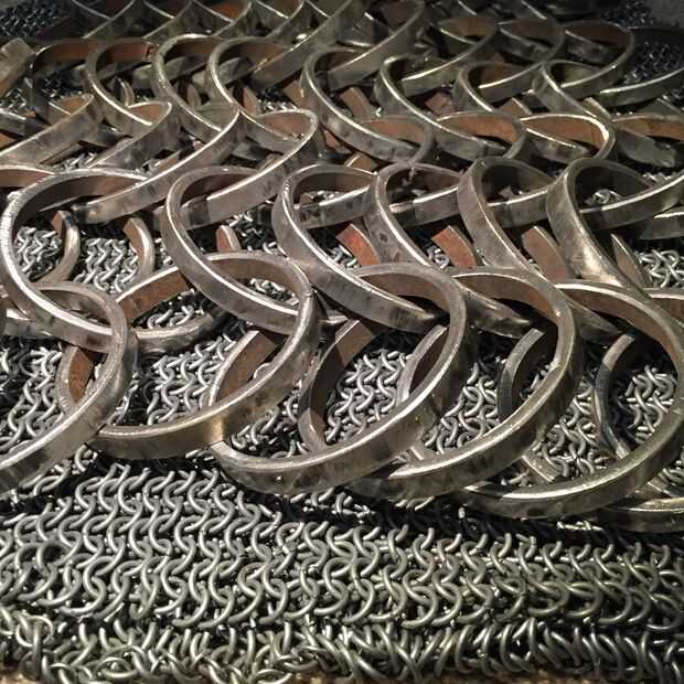 durante mi tiempo de crear mi camiseta de chainmaille, tuve mucho tiempo para pensar. Y uno de mis pensamientos fue la creación de chainmaille muy grande. Este pensamiento sentada en back burner para absolutamente algunos años hasta que me aburría en una tienda de soldadura, con una sierra de cinta y tubería de desecho. Y así empieza el chainmaille gigante.