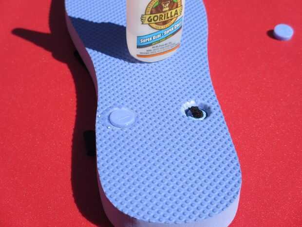 Empuje cada nudo hacia abajo tanto como pueda sin empujar a través de la planta del pie. Cubrir el nudo en la cola y bajar un disco en la parte superior. Empuje hacia abajo realmente duro hasta que el pegamento seque. (Probablemente querrá usar un pedazo de cartón o algo para esto para que no pegue los dedos).