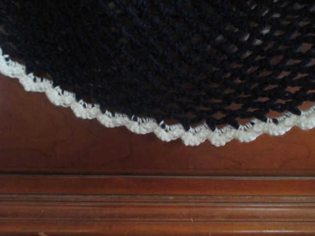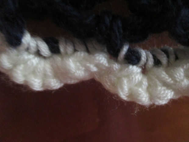 Para el adorno del ganchillo 5 puntadas de ganchillo único en cada bucle. Luego del ganchillo una puntada de resbalón. Hacer esto para cada bucle. Ahora tienes un hermoso adorno para tu chal! Para terminar, sólo tejer en los extremos.