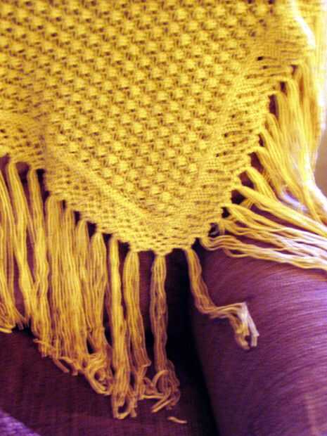 El chal se llama puntada de Trinidad. Es un patrón que he descargado de un sitio web cuyo nombre no recuerdo en este momento. Por supuesto desde que terminé de tejer el cuerpo principal del chal, el patrón parece haber tomado un paseo. El ribete se llama Fireside ribete de encaje y es una reimpresión de la revista de trabajo a destajo por la prensa se entretejen. El patrón llama para bordes o flecos. Cuando descubrí el patrón borde antes de que terminé de tejer el chal inmediatamente imaginó lo en el mantón. No puedo resistir fringe! No puede evitarlo, me encanta Fringe! Este mantón tiene ambos. Me gusta, espero que también lo hacen.