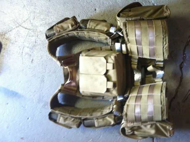 Esto es lo que surgió en su lugar, un MOLLE militar carga rodamiento chaleco o equipo, algunas bolsas del compartimiento, ladrillos y arena. Soy militar activo y engranajes extra sentados por todo el lugar, sin embargo, usted puede encontrar fácilmente un LBV/LBE en una tienda de excedentes local o en línea. Tenga en cuenta que nueva marca tacticool engranaje no ahorrará dinero y algunos excedentes de tiendas intentan robar ciegas.