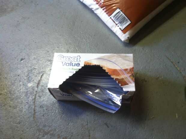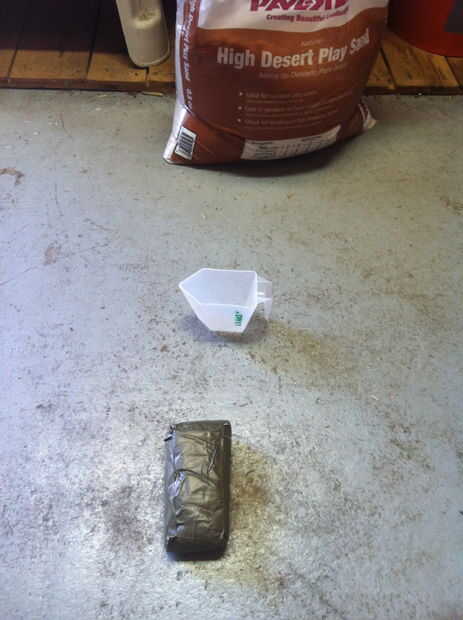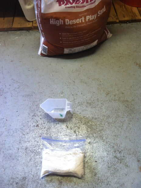 Con la bolsa de arena de juego vierte 2 tazas en cada bolsa Ziploc para mantenerlos relativamente uniforme. Utilicé mi taza de comida de perros para distribuir la arena, ella come bastante jugar fetch en la playa y mi esposa no estaba encantada con la idea de usar su cocina utensilios de medición.