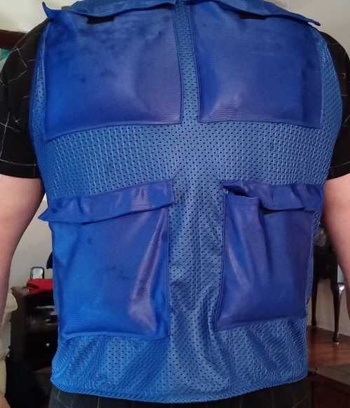 Mi esposa quería Velcro la parte delantera del chaleco también, pero los bolsillos llenos de paquetes para enfriar a un poco demasiado apretado para usar de esa manera. Utilizamos unas correas de nylon con hebillas de plástico sobrado de otro proyecto para el cierre frontal.