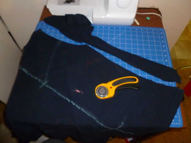 Quite los pernos y corte los costados y mangas. Luego separar el patrón delantero de la parte posterior por el corte a lo largo de las costuras en la parte superior de los hombros. Ahora usted puede cortar la parte delantera por la mitad a lo largo del centro. Colocar las mitades delanteras encima de una otra, revés contra juntos y cortar la parte superior de la parte inferior a lo largo de la línea V. Puso una flecha en cada pieza frontal superior que indica la dirección del grano de la tela, como se indica en las fotos del enlace.